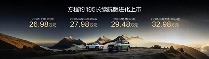 2025年10月20日方程豹 豹5长续航版上市,新车共发布四款车型,全系纯电续航210km,售价区间为26.98-32.98万元。动力上,搭载1.5T前后双电机的比亚超级混动系统,全系纯电续航里程可达210km。