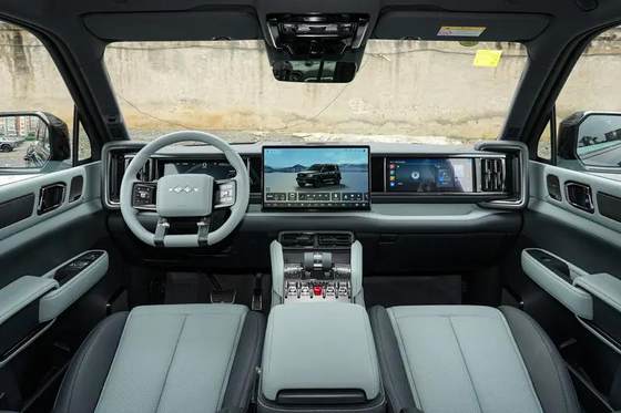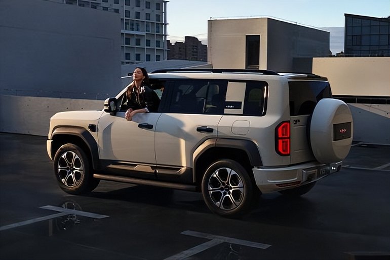 车身侧面和尾部延续现款车型设计,方盒子车身设计、整体车身底部加入黑色护板包裹,搭配超大尺寸轮毂,凸显出硬派SUV的专属特性。尾部,最大变化加入小蓝灯设计,开启后,代表打开智驾系统。两侧竖条状的尾灯组,提高整车的辨识度。