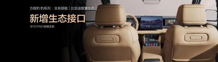 豹5长续航版、豹8大五座版上市即搭载钛7同款比亚迪智慧生态,通过生态设备的“全能管家”比亚迪智慧物联APP,无需复杂操作,也不需要手动连接多个设备,语音指令即能控制全车所有的生态产品。此外,两款新车型的前排座椅背后均加装了生态接口,插入转轴支架后,可以搭配BYD Pad使用。未来将有更多的生态产品,通过生态接口提供用户以智慧互联的无限体验。