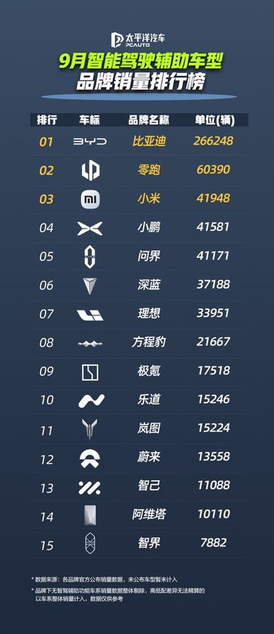 在太平洋汽车发布的9月智能驾驶辅助车型品牌销量榜中,比亚迪汽车荣登榜首,销量是第二名的4倍还多,优势断层领先。。
