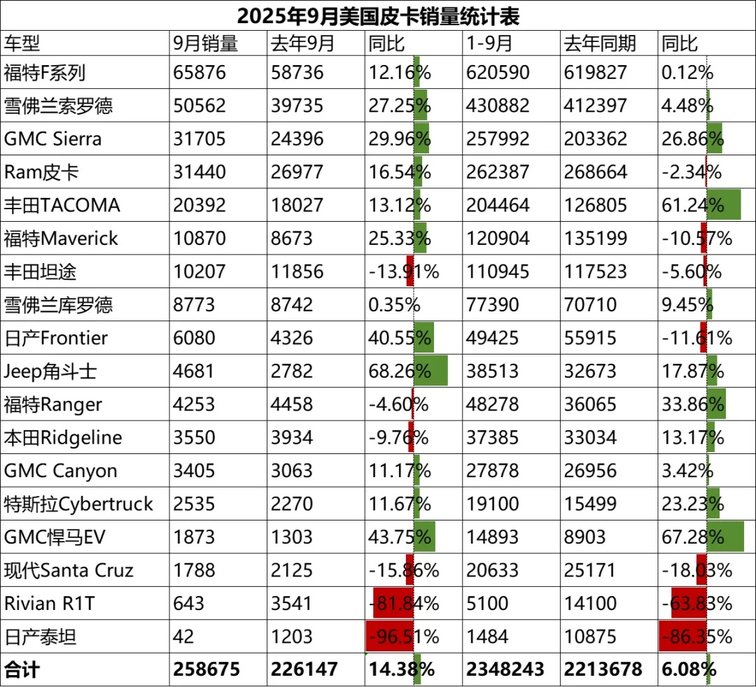 又到了季度结束,美国第三季度皮卡如期公布。本次共有18款皮卡公布了销量。2025年9月,美国皮卡市场合计销量达258675辆,同比劲增14.38%;1-9月累计销量2348243辆,同比增长6.08%,单月热度显著高于累计表现。