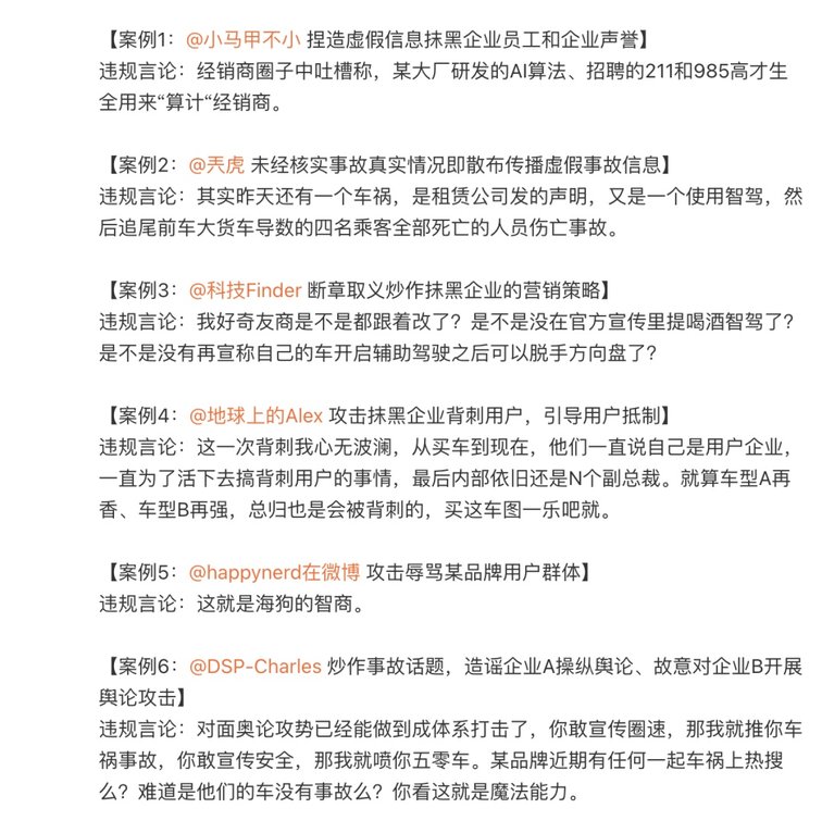 从官方公布的典型违规案例可以看到,涉及此次被禁言的微博用户有@小马甲不小、@兲虎、@科技Finder、@地球上的Alex、@happynerd、@DSP-Charles等。其中,@小马甲不小的违规行为为捏造虚假信息抹黑企业员工和企业声誉。@兲虎的违规行为主要为未经核实事故真实情况即散布传播虚假事故信息。@科技Finder的违规行为主要为断章取义炒作抹黑企业的营销策略。@地球上的Alex的违规行为主要为攻击抹黑企业背刺用户,引导用户抵制。@happynerd、@DSP-Charles的违规行为分别为攻击辱骂某品牌用户群体与炒作事故话题,造谣企业A操纵舆论、故意对企业B开展舆论攻击。