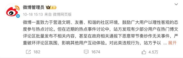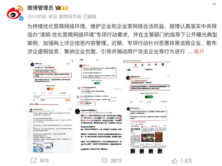 10月20日,微博管理员发文称,为持续优化营商网络环境,维护企业和企业家网络合法权益。近期,针对恶意抹黑诋毁企业、散布涉企虚假信息、集纳企业负面、引导并煽动用户攻击企业等行为进行重点打击,并责令对存在相关违规行为的多名汽车领域KOL用户予以禁言90天、禁止广告收益180天的处置。