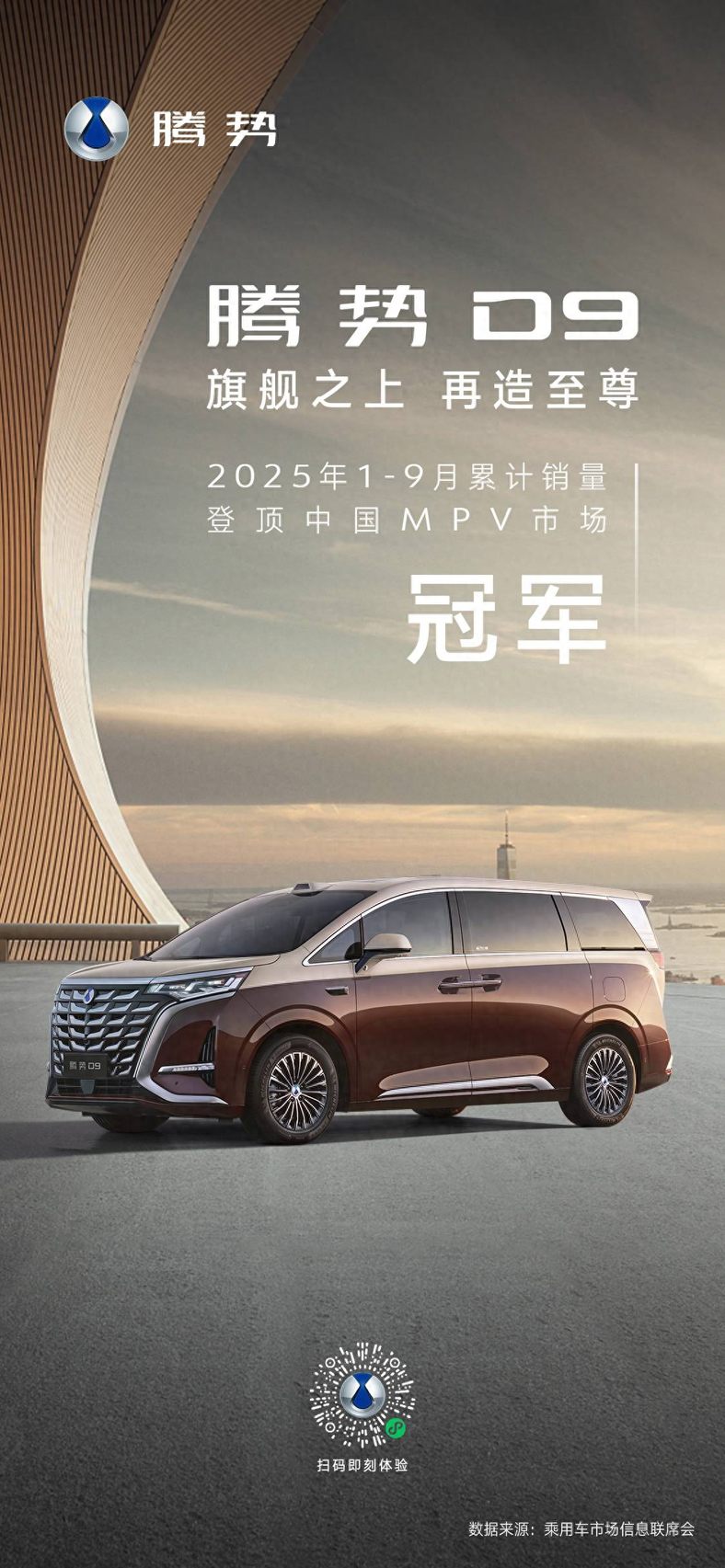 最新数据显示,凭借持续强劲的市场表现,腾势D9斩获1-9月中国MPV市场销量冠军。这进一步巩固了其在中国MPV市场的领导地位,并再次验证其作为现象级产品的强大市场号召力。