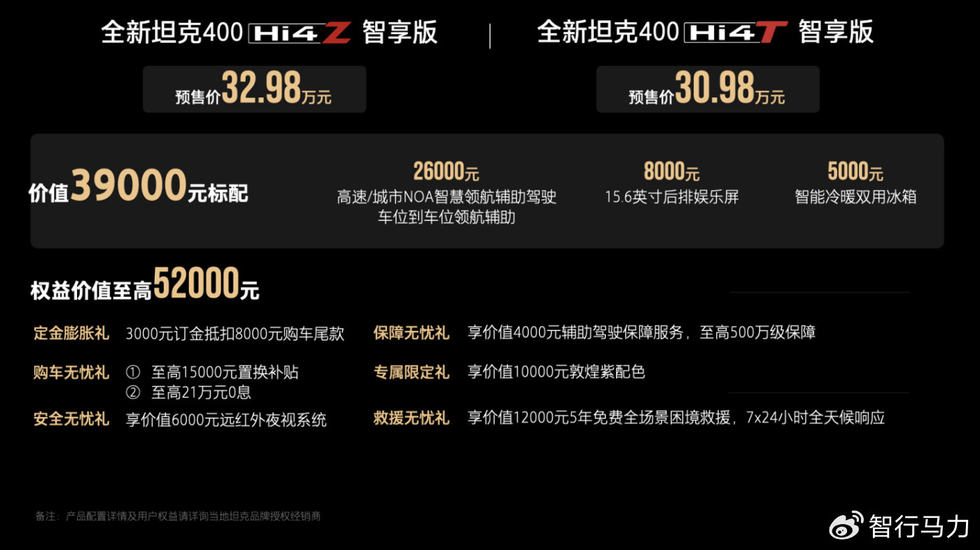 目前全新坦克400 Hi4-Z智享版、全新坦克400 Hi4-T智享版已同步开启预售,预售期间预订可享6重尊崇权益,全新坦克400以满满诚意为年轻用户体验潮酷越野带来惊喜购车优惠。