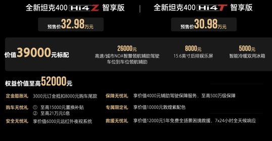目前全新坦克400 Hi4-Z智享版、全新坦克400 Hi4-T智享版已同步开启预售,预售期间预订可享6重尊崇权益,全新坦克400以满满诚意为年轻用户体验潮酷越野带来惊喜购车优惠。