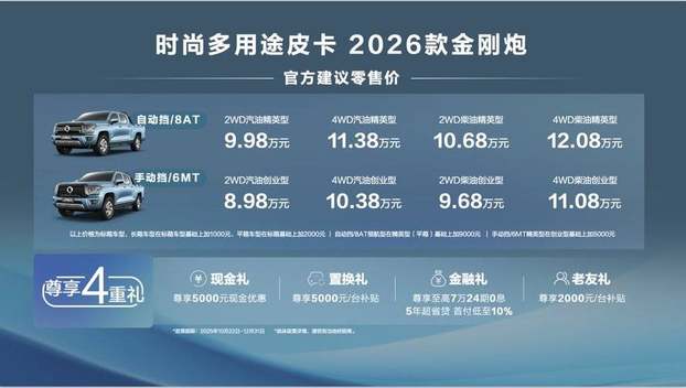10月22日,时尚多用途皮卡——2026款金刚炮在荆门智慧工厂焕新上市。金刚炮8AT车型,官方建议零售价9.98万元起;金刚炮6MT车型,官方建议零售价8.98万元起。并同步推出5000元现金礼、5000元置换礼、2000元老友礼以及7万24期0息金融补贴四重豪礼。