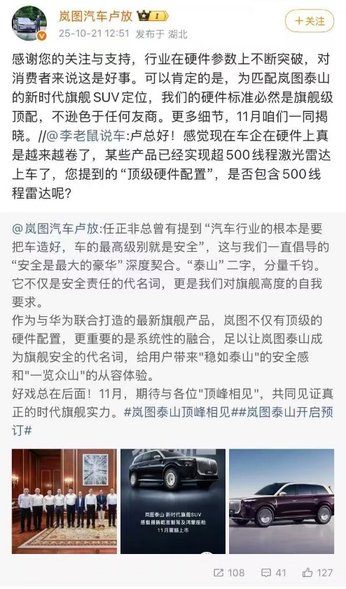 此外,从岚图汽车董事长、总经理卢放与媒体的微博互动可以大胆推测,岚图泰山极有可能首发搭载华为超500线程激光雷达,形成“感知硬件+智能座舱+智驾系统”的全栈式华为技术阵容,剑指50万级高端豪华SUV市场。超500线程激光雷达的搭载,意味着点云密度与探测精度实现数量级提升,可实现对细小障碍物、远距离弱光目标的识别更精准,将显著提升车辆在极端天气、夜间行车等复杂环境下的感知可靠性,为L3+级智能辅助驾驶功能提供更强大的感知冗余。结合华为最新乾崑智驾,岚图泰山有望在城区NCA、复杂路口通行等场景中展现领先能力。