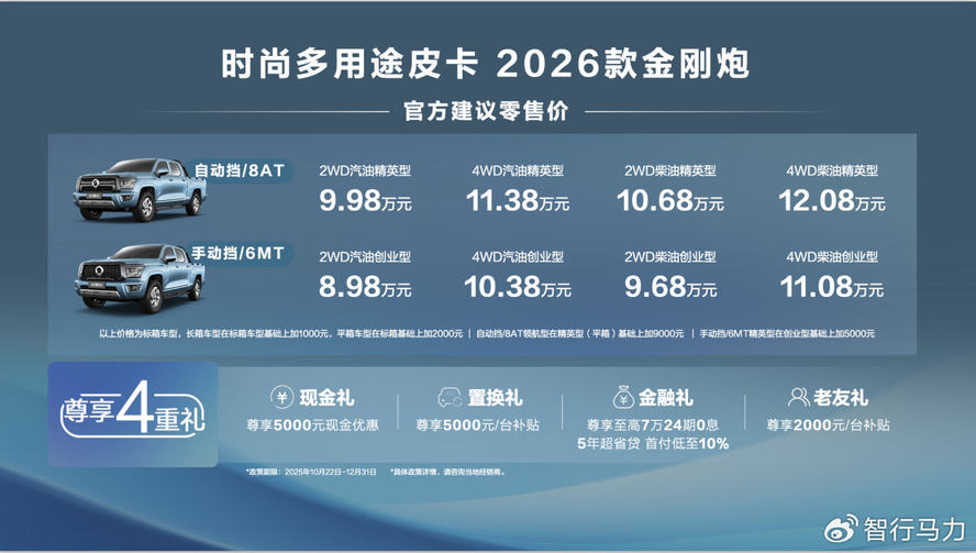 10月22日,时尚多用途皮卡——2026款金刚炮在荆门智慧工厂焕新上市。金刚炮8AT车型,官方建议零售价9.98万元起;金刚炮6MT车型,官方建议零售价8.98万元起。并同步推出5000元现金礼、5000元置换礼、2000元老友礼以及7万24期0息金融补贴四重豪礼。