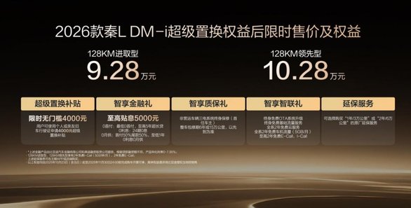 10月23日,2026款秦L DM-i正式上市,共2款车型,包括128KM进取型和128KM领先型,官方指导价9.68-10.68万元。2025年11月30日24:00前完成购车开票可享限时无门槛超级置换补贴4000元,补贴后售价9.28-10.28万元。