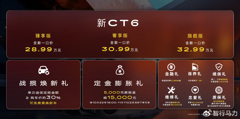 凯迪拉克以创新虚拟现实技术发布百万级磁浮底盘,搭载该底盘的全尺寸旗舰轿车凯迪拉克新CT6也同步正式上市。新CT6优化配置结构,精简为臻享、奢享、旗舰三款车型,配置全面升级,全款一口价28.99万元起。同时,新CT6重磅推出备受用户好评的“战损焕新礼”——单次车损超过购车价三成可置换等价新车,目前已有超过60位凯迪拉克车主享受该权益。不仅有未来的安心保障,凯迪拉克更带来了当下可享的诚意,即日起至“双十一”,用户可享5000元定金抵15000元购车款的限时膨胀礼遇。不仅如此,新CT6还带来了忠爱礼、续保礼、金融礼、保养礼等八大权益。凯迪拉克新CT6诞生于品牌专属旗舰豪华后驱平台,不仅搭载百万级磁浮底盘,更融合品牌先锋设计语言与极致豪华细节,为用户带来顶级驾驶乐趣与越级乘坐体验。即刻下定凯迪拉克新CT6,解锁专属百万级豪华奢享新境!