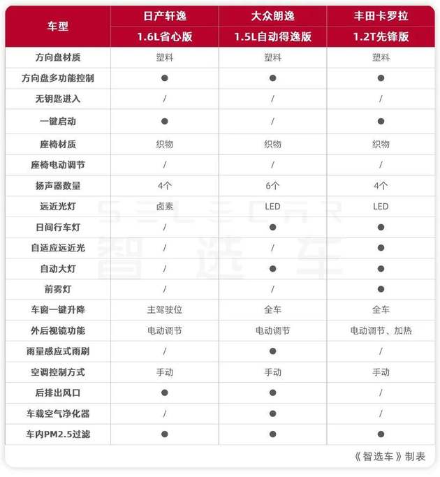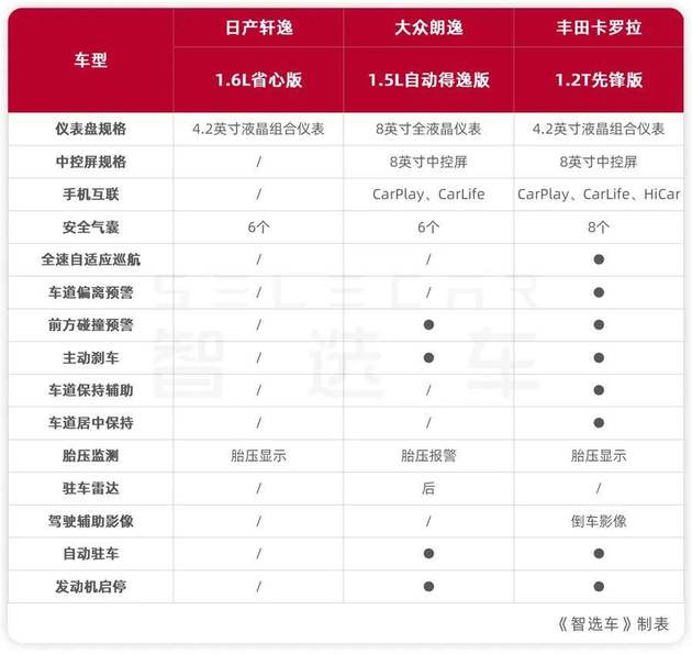 其余配置则是卡罗拉完胜,轩逸和朗逸有的它都有,还多出了自适应远近光、前雾灯、外后视镜加热。看得出来,卡罗拉在配置方面要比另外两款车更舍得下本。