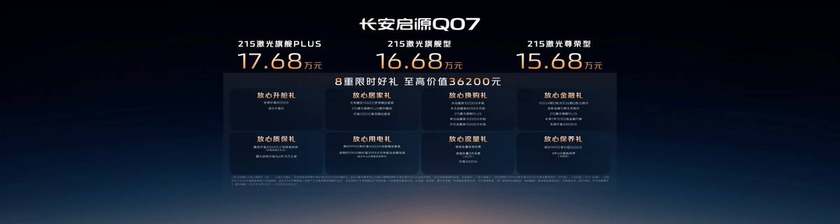 10月10日,全家人的智能SUV——长安启源Q07天枢智能激光版正式上新,共推出3款产品,分别为215激光尊荣型、 215激光旗舰型和215激光旗舰PLUS,上新价为15.68万元- 17.68万元。