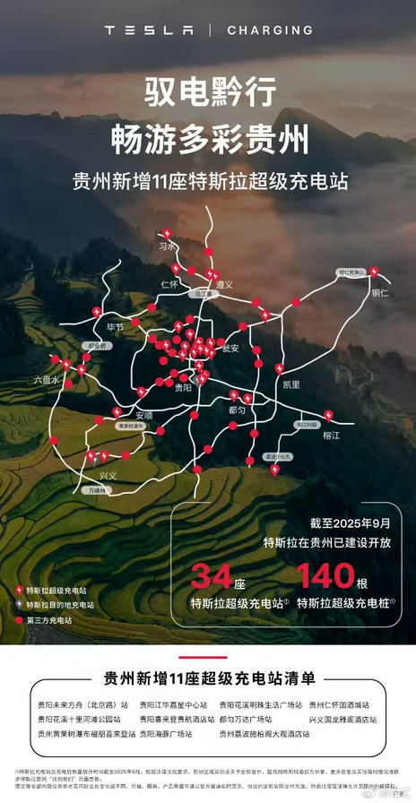 值得一提的是,2025年第三季度特斯拉在贵州集中投运9座V4超充站,覆盖贵阳主城区及都匀、兴义等旅游城市。黄果树瀑布、荔波等景区周边站点的设立,进一步打通“高速+文旅”充电动线,为全省及外来自驾用户提供便利。