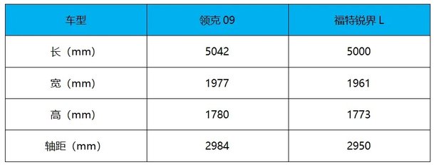 尺寸方面,领克09的长宽高分别为5042×1977×1780毫米,轴距2984毫米,采用大五座布局。福特锐界L的车身尺寸为5000×1961×1773毫米,只比领克09略微短一些,轴距2950毫米,比领克09短了34毫米。