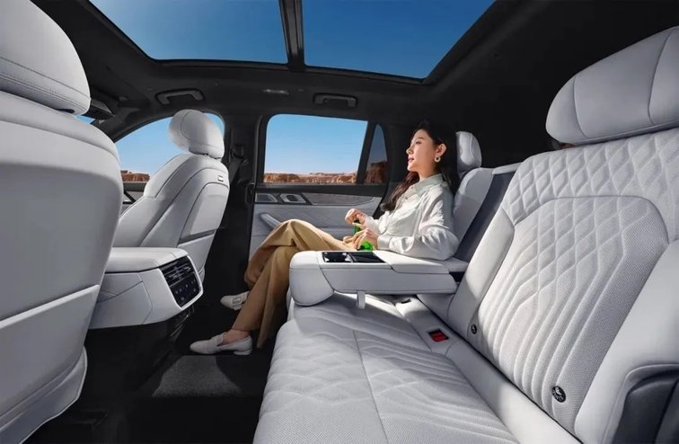 内饰方面,温暖明亮的色调与黑色饰板形成鲜明对比,搭配大面积真皮包裹与精致缝线,有效消解大型 SUV 的压抑感,营造温馨高级的驾乘氛围。中控台延续非对称设计,15.4 英寸中控屏向驾驶员侧倾斜,配合 12.3 英寸全液晶仪表与 HUD 抬头显示,构建三屏交互体系。