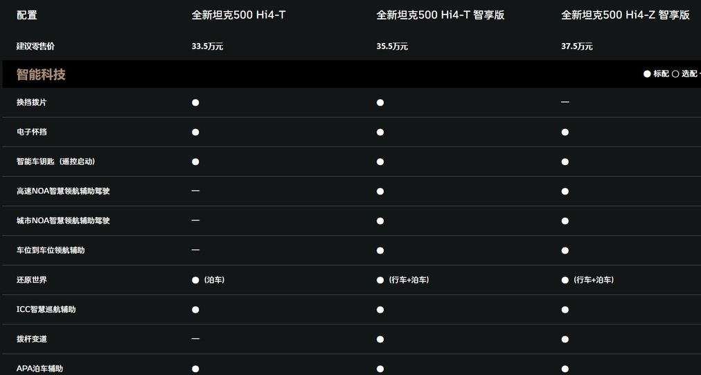 动力层面,Hi4-T版本电机功率从120千瓦提升至130千瓦,Hi4-Z版本直接移植坦克500的双电机系统,动力参数全面领先现款;内饰的怀挡机构、Nappa座椅、后排娱乐屏、车载冰箱等配置,放在同级别车型里都是越级水平。单从“加量”的幅度来看,2万的差价似乎合情合理,但问题的关键在于,当前硬派越野市场早已不是坦克一家独大。