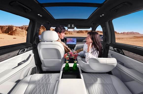 宽绰空间是基础,奢适配置更是一步到顶。二排新增多功能中央扶手,放倒秒变商务四座行政座舱;二排小桌板,既是长途自驾的阅读桌和移动餐吧,又是商务出行的移动工作台。全车Nappa真皮覆盖,三档加热、通风和8点式背部按摩由前排独享进阶为四座同享,带来二排舒压放松的平权,搭配双层静音隐私玻璃和遮阳帘,能有效防晒、保护隐私;车内还配备14扬声器Bose定制音响、海洋之谜香氛系统以及四温区空调等诸多高端配置,私享尊贵感拉满,所见、所触、所听、所享在30万内一步到顶,尽显豪华。同时,副驾还新增280mm一体式4向电动腿托,可一键开启女王专享,舒适躺姿堪比航司头等舱。