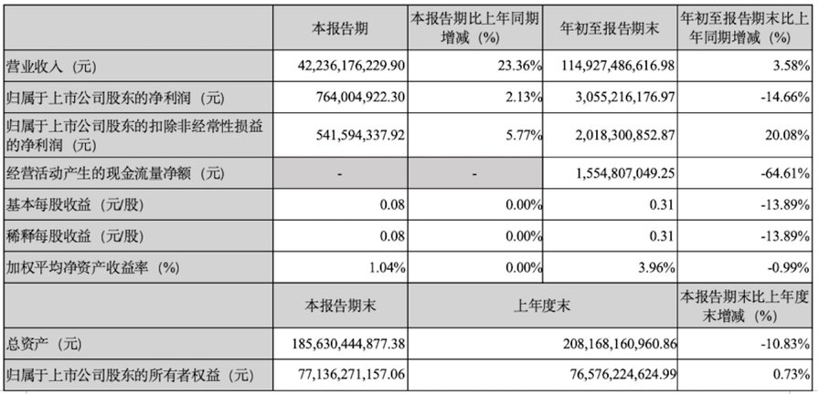 10月24日晚,长安汽车发布2025年第三季度财报显示:经营规模稳健增长,产品结构持续优化,经营质量稳健向好。长安汽车三季度实现营业收入422.36亿元,同比增长23.36%;归母净利润7.64亿元,同比增长2.13%;扣非后净利润5.42亿元,同比增长5.77%。