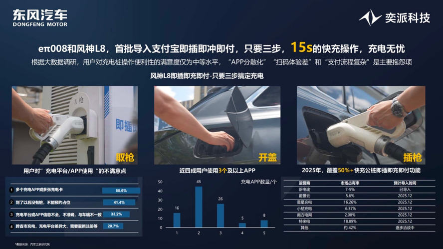 充电体验:首创支付宝“即插即充即付”,15秒轻松搞定。