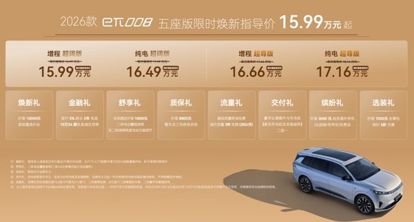 央企严选品质硬,家庭用车更放心。2026款eπ008五座版提供增程、纯电两种动力,超阔版、超尊版两种配置,共计四款产品,限时焕新指导价15.99-17.16万元,还可享受多重上市权益。