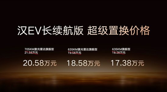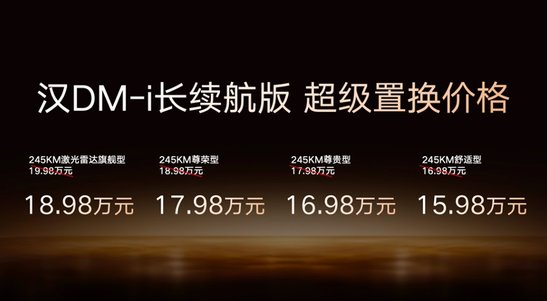 其中,汉 DM-i长续航版纯电续航提升至 245 公里,亏电油耗仅 3.44L/100km,补贴后官方指导价为 15.98 万-18.98 万元;汉 EV 长续航版共推出3 款车型,续航覆盖 635km 与705km,补贴后官方指导价为 17.38 万-20.58 万元。特别提醒:上述补贴后指导价,需在 10 月 31 日前完成购车并享受 1万元超级置换补贴,属于限时优惠价格。