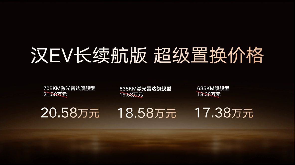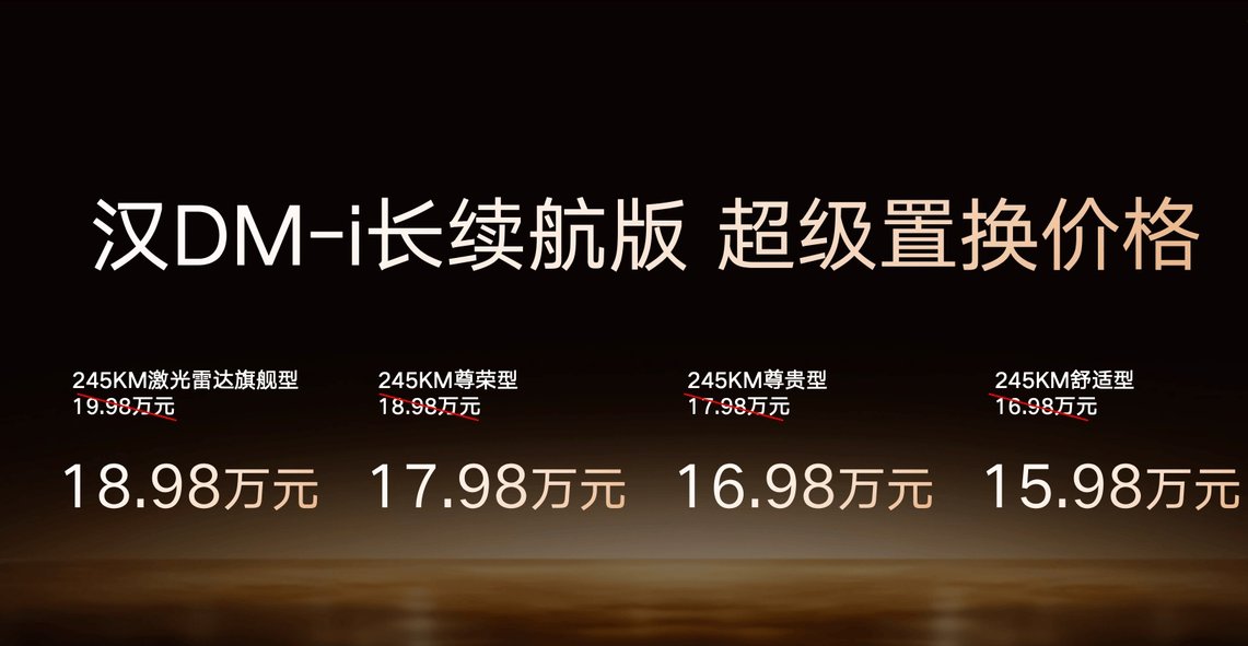 其中,汉 DM-i长续航版纯电续航提升至 245 公里,亏电油耗仅 3.44L/100km,补贴后官方指导价为 15.98 万-18.98 万元;汉 EV 长续航版共推出3 款车型,续航覆盖 635km 与705km,补贴后官方指导价为 17.38 万-20.58 万元。特别提醒:上述补贴后指导价,需在 10 月 31 日前完成购车并享受 1万元超级置换补贴,属于限时优惠价格。