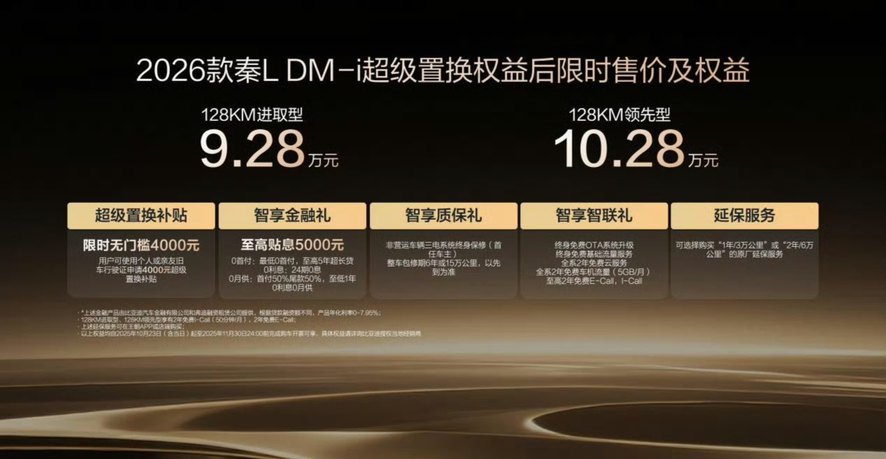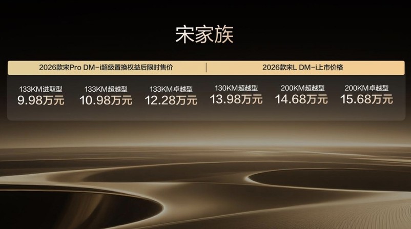 其中,2026款宋L DM-i售价13.98-15.68万元,2026款宋Pro DM-i超级置换权益后,限时售价9.98-12.28万元。同时,两款车型均带来了丰厚的上市权益礼。