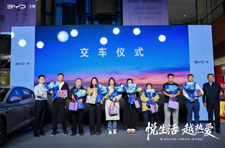 活动尾声,比亚迪王朝为哈尔滨首批2026款秦宋车主颁发精美的交车鲜花,祝贺他们正式加入比亚迪王朝大家庭,开启全新美好旅程。