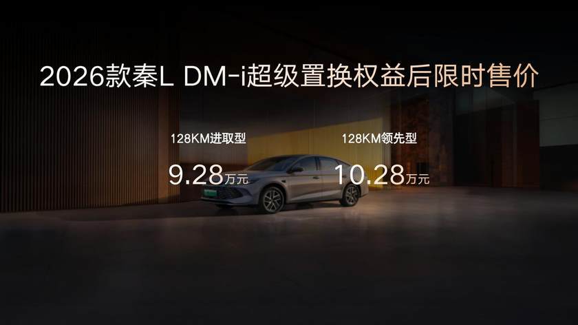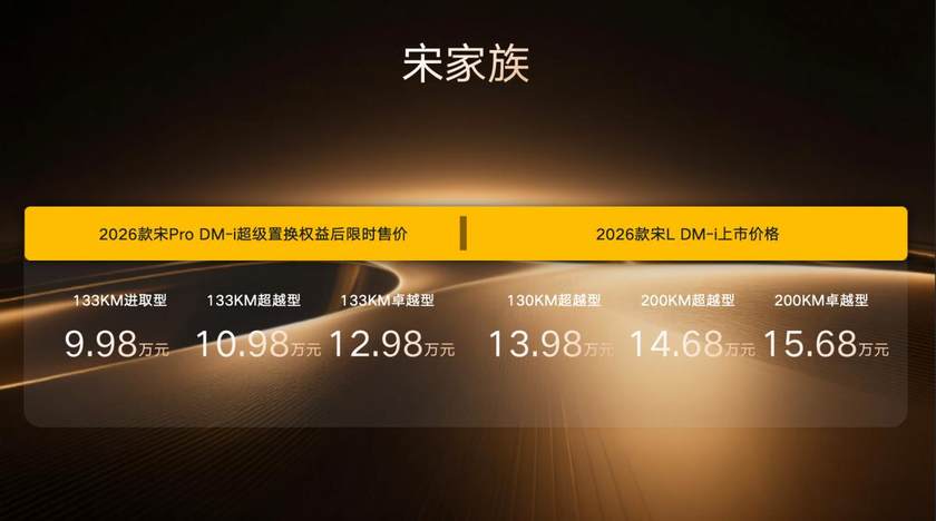 其中,2026款宋L DM-i官方指导价为13.98万元-15.68万元,2026款宋Pro DM-i超级置换权益后限时售价9.98万元-12.28万元,26款秦L DM-i超级置换权益后限时售价9.28万元-10.28万元。
