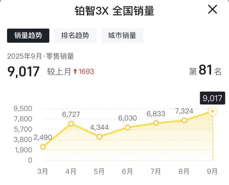 从销量数据来看,铂智3X的市场表现呈现出"稳健增长"的健康态势:3月上市后快速打开市场,4月迎来首轮高峰;5月短暂调整后,6月以6030辆重启增长引擎,7月6833辆、8月7324辆实现"三连涨",9月更是迎来爆发式增长,环比增幅超23%,最终以9017辆的成绩摘得9月合资新能源销量桂冠。