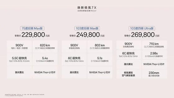 10月28日,“全家都满意的豪华SUV”焕新极氪7X正式上市,新车共推75度后驱Max版 、103度后驱Max版、103度四驱Ultra版三款配置版型,官方零售价分别为229,800元、249,800元和269,800元。超级置换权益后限时售价分别为219,800元、239,800元和259,800元。即日起,用户可通过极氪App、极氪官网、极氪小程序、全国各大城市的极氪门店等官方渠道进行预定。