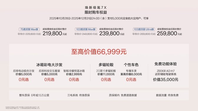 2025年10月28日至12月31日(含)期间支付5,000元定金的大定用户,全系赠送价值12,999元的冰箱彩电大沙发,全系免费升级20英寸265mm宽胎以及专属车漆,并可享价值35,000元的ZEEKR AD H7进阶辅助驾驶系统终身免费功能体验。 与此同时,首任极氪老车主增换购焕新极氪7X可享每年1000度的5年免费充电权益。此外,2025年11月30日(含)前,下定且锁单的用户,如因极氪原因,无法在2025年开票交付,导致无法全额享受购置税优惠,对于政策退坡产生的差额,极氪品牌提供至高13,500元的购车尾款抵扣。