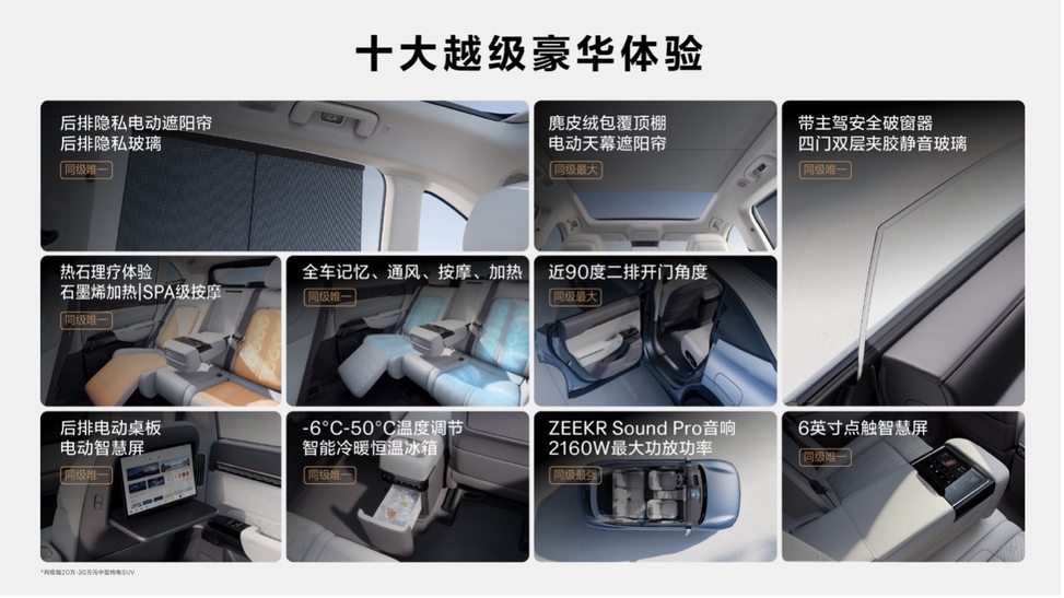 豪华MPV级的后排。基于SEA浩瀚架构而来的焕新极氪7X,实现了同级领先的83.34%得房率, 后排腿部空间达到同级最大的1187mm。同级最大905L后备厢空间以及同级最多的40处魔法储物空间,让生活收纳随心所欲。同级唯一的二排可移动滑轨、近90°二排最大开门角度等巧思设计,让儿童座椅拆装与抱娃上下车轻松自如。同时在配置层面,焕新极氪7X给后排家人带来豪华MPV 级的奢享体验,新增同级独有的石墨烯加热以及热石理疗功能,更集合电动躺椅、电动腿托、电动遮阳帘、电动桌板、后排电动智慧屏、后排中央扶手6英寸点触智慧屏等越级豪华配置于一体。