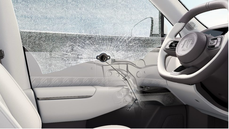 值得一提的是,区别于普通双层夹胶玻璃,焕新极氪7X采用外层3.5mm钢化玻璃+0.76mmPVB胶膜+ 内层1.1mm钢化玻璃的设计,表层压应力和内部张应力形成力学平衡,主驾安全破窗器可以轻松击穿。