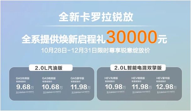 全新卡罗拉锐放价格体系极具竞争力,配合“焕新启程礼30000元”限时权益,进一步降低购车门槛。