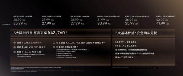本次阿维塔12四激光版上市,还推出了重磅购车礼遇,至高可享43,760元,5大限时权益。首任车主终身三电质保;超级置换礼10,000元现金;价值13,760元用车礼包;可享价值20,000元ADS 高阶功能包等额抵扣券;可享贷5年首2年0息政策。