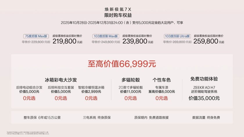 定价策略是最锋利的武器,官方22.98万-26.98万元的指导价,经超级置换后限时21.98万-25.98万元,再叠加12999元冰箱彩电大沙发、20英寸宽胎、专属车漆及35000元ZEEKR AD H7终身免费功能,实际裸车成本低于同级80度两驱车型。