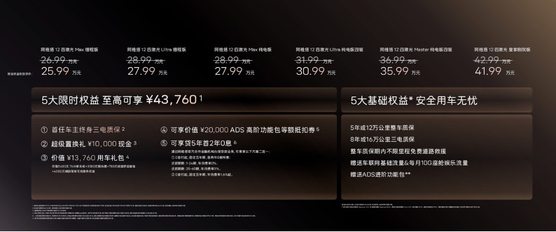 本次阿维塔12四激光版上市,还推出了重磅购车礼遇,至高可享43,760元,5大限时权益。首任车主终身三电质保;超级置换礼10,000元现金;价值13,760元用车礼包;可享价值20,000元ADS 高阶功能包等额抵扣券;可享贷5年首2年0息政策。