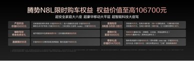 为回馈广大用户的支持与信赖,腾势N8L特别推出限时购车权益,权益价值至高10.67万元!包括价值1.7万元的三年免息,最高1万元的置换补贴。此外,不必担心因为交车晚,享受不到购置税补贴:在2025年11月30日24点前完成合同签署的用户,如果因非用户原因车辆未及时交付,导致开票实际发生在2026年,可享受购置税差额补贴,最高1.5万元!