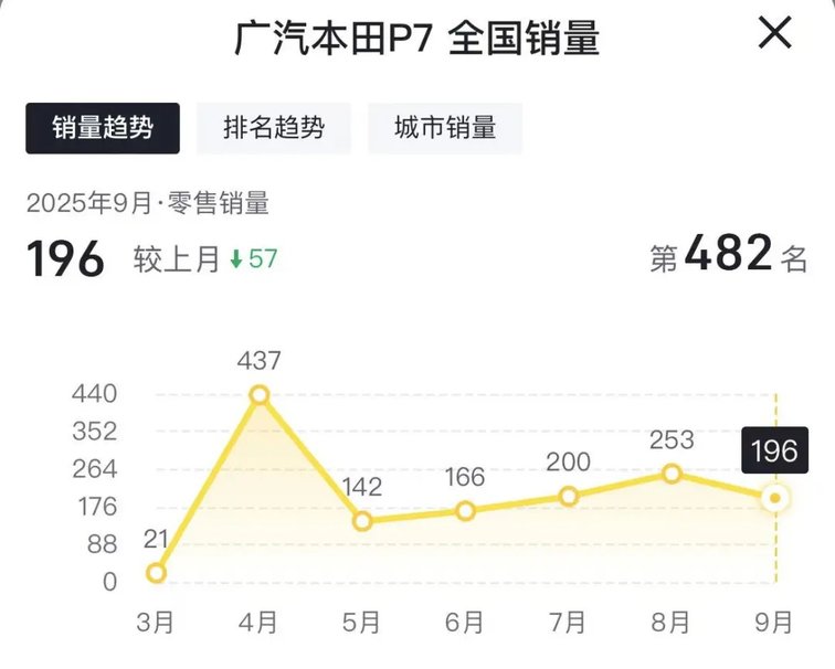 这场"急刹车"式的降价,背后是广汽本田P7难以回避的销量压力。作为品牌在纯电中型SUV市场的关键布局,该车自2025年4月上市以来,销量表现持续低迷:4月首月销量437辆后,5月直接跌至142辆,随后半年内(4-9月)月销量始终在200辆左右徘徊,6个完整月份累计销量仅1394台,月均销量仅200余辆。