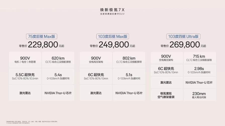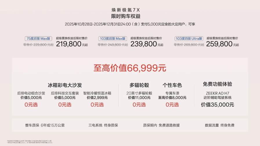 10月28日,焕新极氪7X以“不妥协的豪华”姿态登场,官方零售价分别为229,800元、249,800元和269,800元,超级置换权益后限时售价219,800元起。它不盲从溜背潮流,却以83.34%同级最高得房率重新定义空间哲学;它拒绝同质化配置堆砌,却以全系标配137项豪华科技重塑价值标杆。这,是一场关于家庭豪华SUV的“原点革命”。