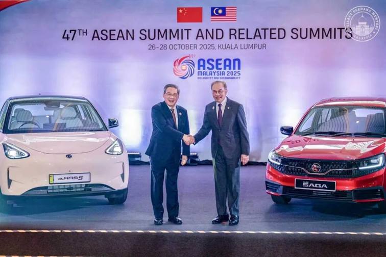 2025年10月28日,在东盟峰会的多边舞台上,中国国务院总理李强与马来西亚首相安瓦尔·易卜拉欣并肩站立,在吉利控股集团董事长李书福的陪同下,共同参观了全新宝腾Saga和宝腾e.MAS 5的首次公开展示。