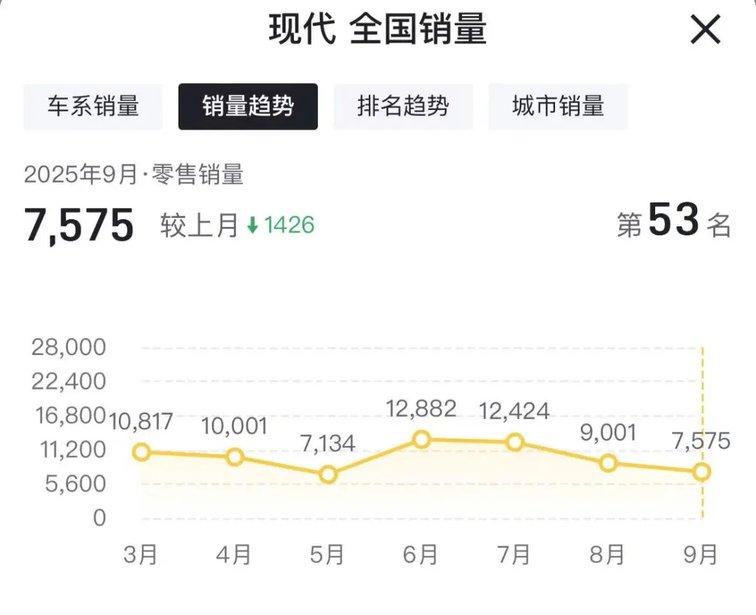 从传播效果看,北京现代确实达成了 “破圈” 目标。在新能源转型浪潮中,这个曾经的合资巨头正经历前所未有的市场寒冬:近五年销量从 2020 年的 50.2 万辆断崖式下跌至 2024 年的 15.4 万辆,2025 年前几个月月均销量不足万辆,本来是汽车市场的“金九”,9月销量仅7575辆。