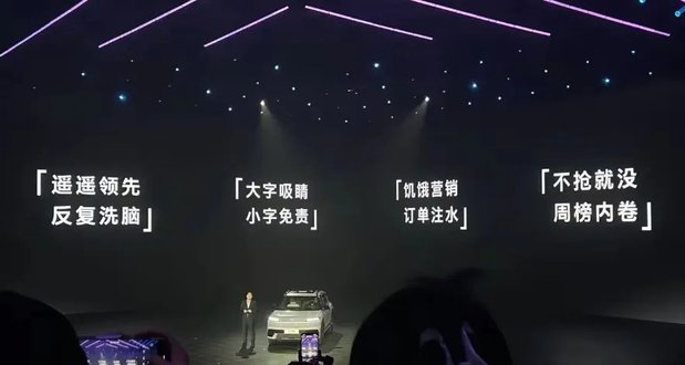 这四句直指当前新能源汽车市场乱象的评语,精准戳中了行业长期存在的营销痛点,其中 “遥遥领先” 等表述更是被普遍解读为暗指特定头部车企,“小字免责”则更具行业典范指向某米汽车,瞬间引发媒体与网友的热议狂欢。