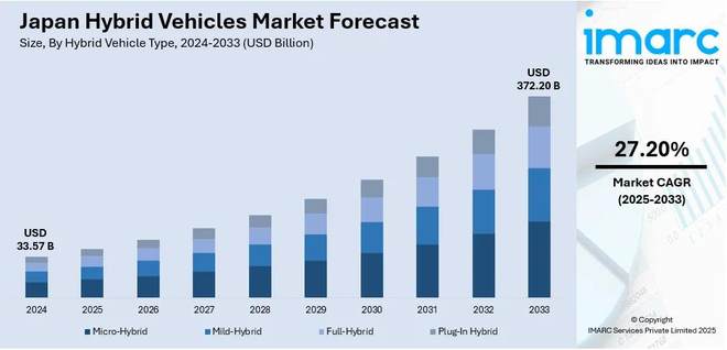 数据显示,2024年日本混动车销量超过204万辆,首次突破200万大关。部分年份,混动车型甚至占据了新车销量的六成以上。在油价上涨和消费者追求节能的驱动下,日本混合动力汽车市场规模持续增长。市场研究机构IMARC Group预计,到2033年,日本混动车市场规模将达到3722亿美元。