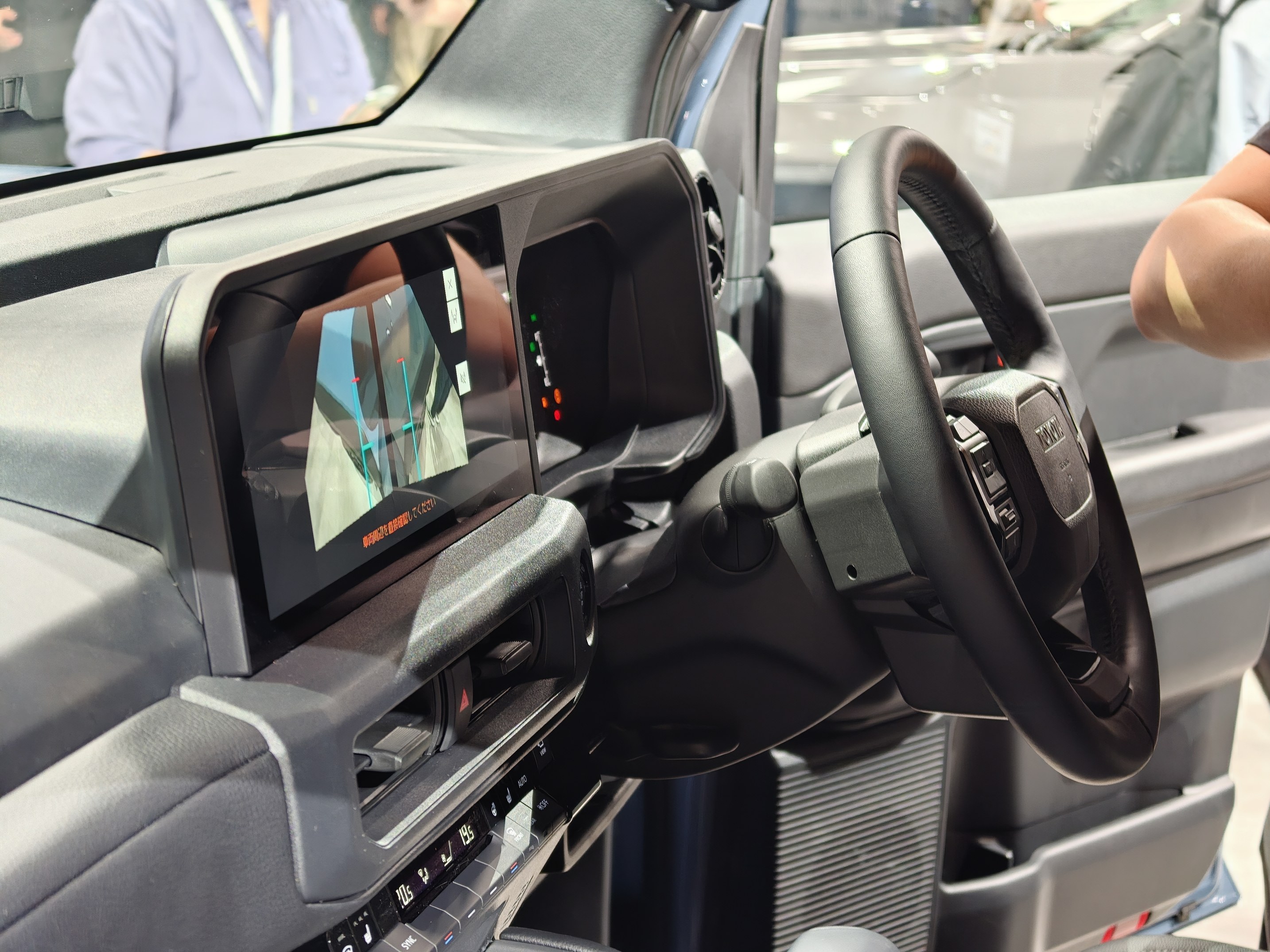 外观设计上,展车采用的是方灯设计,C型LED日行灯。同时前脸进气格栅也是点阵式,中间没有使用传统的牛头标而是TOYOTA字母标。底部巨大的前保险杠采用了防撞钢梁的设计方式,主打一个实用耐操。