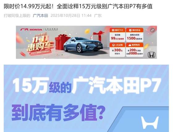 10月28日,广汽本田官宣旗下P7纯电SUV开启限时调价:车型起售价从上市时的官方指导价25.99万元起售价降至14.99万元,直接下调11万元,官方同步打出“15万级的广汽本田P7有多值”的宣传口号,强调其价格竞争力。(上市时官方公布了“官方指导价”与“一口价”双重价格体系,其中实际销售采用“一口价”政策)