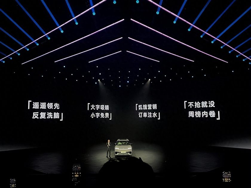 发布会现场,在一张PPT上赫然出现了32个大字,上面分别为“遥遥领先反复洗脑”“大字吸睛小字免责”“饥饿营销订单注水”“不抢就没周榜内卷”。