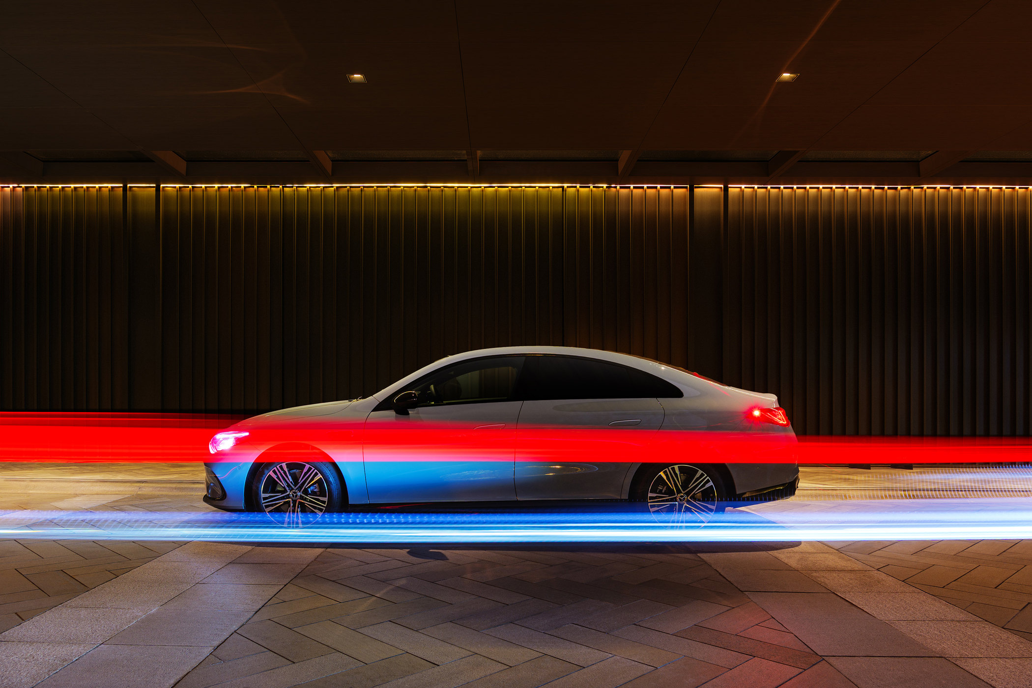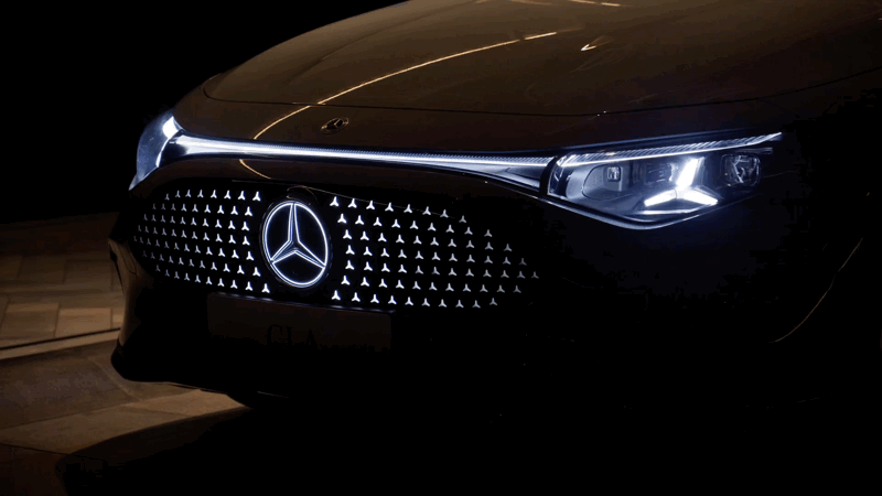 走近全新奔驰纯电CLA,解锁的瞬间,光便有了生命。车头142颗可独立发光的LED三叉星徽如被夜风拂过的萤火,次第苏醒,光波从中央的三叉星徽向两侧舒卷,仿佛星河在轻声呼吸。你看,是光在与世界对话——每一次相遇,都用这流转的星语温柔致意。